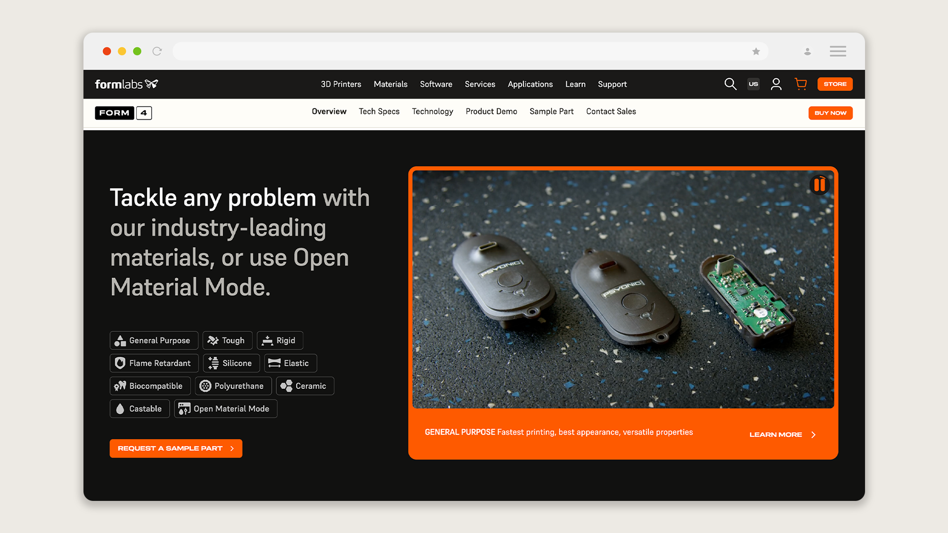 Transforming the website from a product showcase into a functional tool was a central theme of this project. The goal was to make Formlabs.com a space where users could not only discover products but also find solutions to their challenges, research applications, and calculate return on investment (ROI). Key features introduced include: